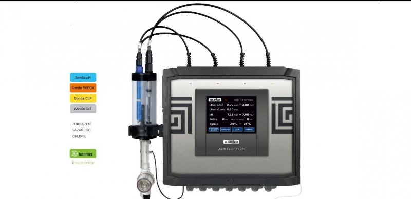 ASIN Aqua PROFI je řídící automat určený pro veřejný sektor s nejvyššími požadavky na přesnost řízení a splnění veškerých hygienických norem. Automat je vybavený sondou CLF pro měření volného chloru, sondou Redox, sondou pH a volitelně sondou CLT pro měření celkového chloru.