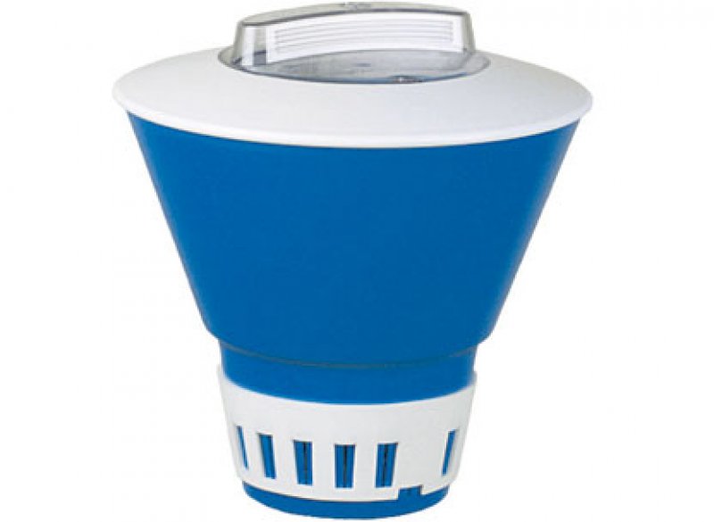 Plovoucí dávkovač chloru na pomalurozpustné tablety. Ve spodní části je regulátor pro úpravu množství dávkované chemie..